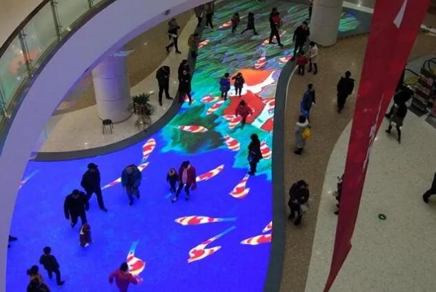 洪海智能光電公司在山東臨沂齊魯園制作的室內(nèi)異形LED互動(dòng)地磚屏,剛一安裝完工就引起了群眾們極大的反響。此LED互動(dòng)地磚屏的總面積達(dá)到136平方米,用以p6.25的像素,安裝在齊魯園室內(nèi)的地面上,從其外觀造型的角度講,該地磚屏類似于陰陽太極圖上的陰陽魚,具有招風(fēng)水的美好寓意;而從功能技術(shù)上講,該地磚屏具有承重性、防護(hù)性、散熱性以及互動(dòng)性,然而其中較數(shù)互動(dòng)性最具創(chuàng)意感,是根據(jù)捕捉人的活動(dòng)軌跡展現(xiàn)出互動(dòng)的效果,從而呈現(xiàn)出足下生花之感,依此達(dá)到人屏合一的感觀效果。