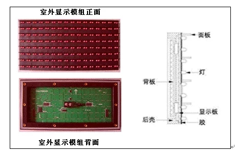 上圖為16x8(2紅)的室外屏模組。加了防水結構用于全戶外,我們可以看到塑料殼體,最右側是它的整個結構刨圖:顯示板上插的是燈珠、背板上是顯示驅動電路,這是分體結構的,也有的是將顯示板和顯示驅動電路做在一塊電路板上的整體結構的,下面的兩個圖我們可以看到區別。面板、后殼其實是一個塑料罩殼,面板上對應燈珠位置開有孔,以使燈珠漏出頭,后殼上有用于安裝的螺絲孔或磁柱,使模塊便于組裝。模塊的前面灌有顯示屏專用的防水膠。