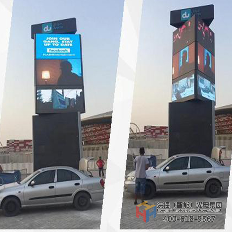 在去洪海之前,有必要先說說什么是三棱魔方柱,三棱魔方柱也稱之為LED旋轉魔方柱(LED旋轉魔方屏、魔方屏、三棱柱等),主要有兩種一種只旋轉不可以張開,一種是既可以旋轉也可以張開并且合并(見圖一),所謂三棱魔方柱,是由三個LED顯示屏魔方箱體組成,每個箱體可以像魔方一樣360°旋轉,旋轉的同時能夠播放視頻動畫。旋轉動作和畫面相互配合,是集機械力學、工業編程和視頻編輯等多功能于一身的新型廣告媒體。當然了,可以根據客戶的需求訂做四個甚至更多,也可以三面做成四面的。